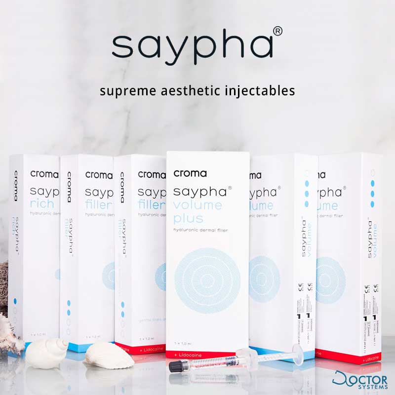 Saypha Rich®, ácido hialurônico não reticulado, mas estabilizado pelo glicerol (hidratante natural) e com alto peso molecular. É indicado para repor a perda de ácido hialurônico devido ao processo de envelhecimento, melhorar a hidratação, tônus e elasticidade da pele, atuar no preenchimento de rugas finas, como pés de galinha, linhas de sorriso ou linhas ao redor da boca.
